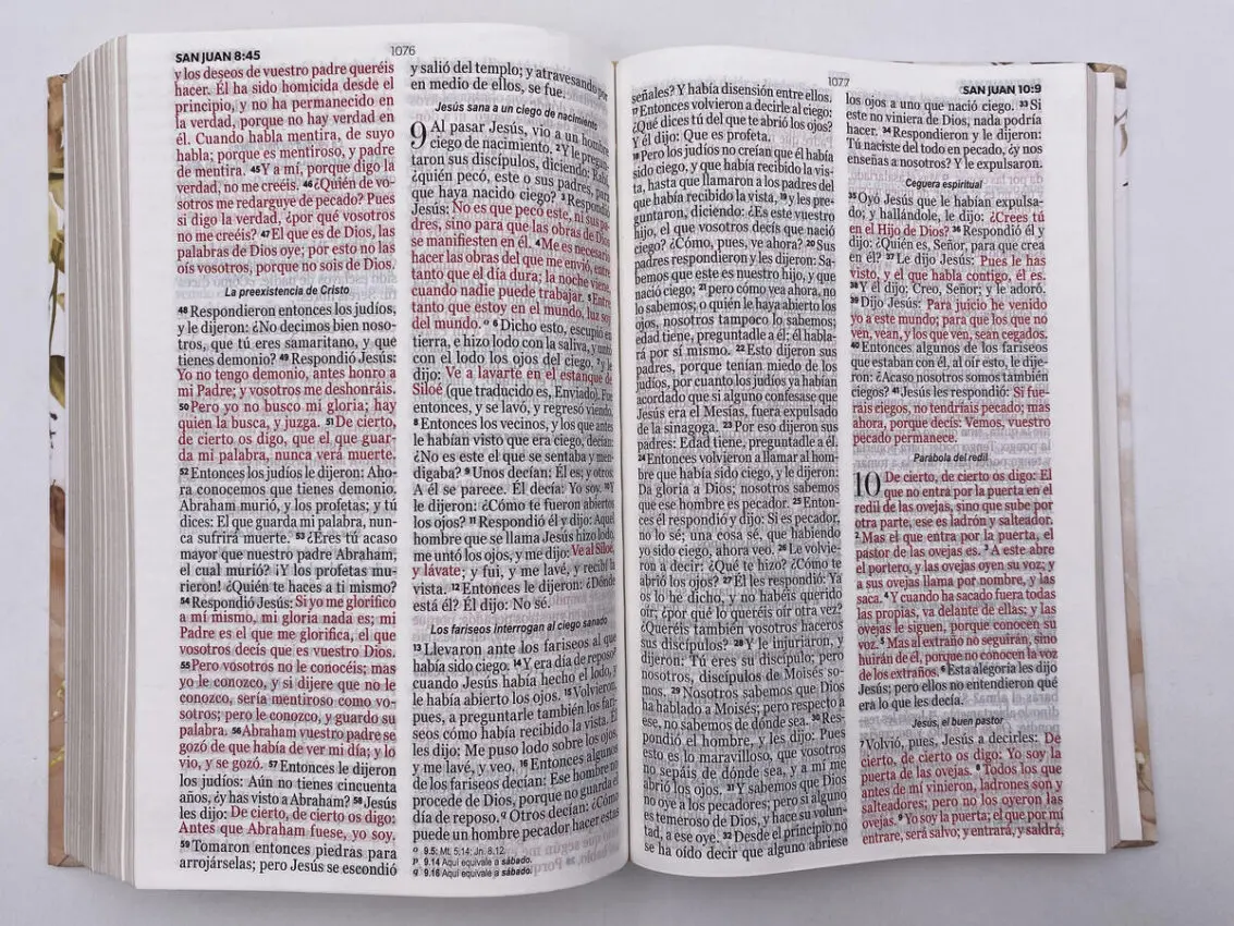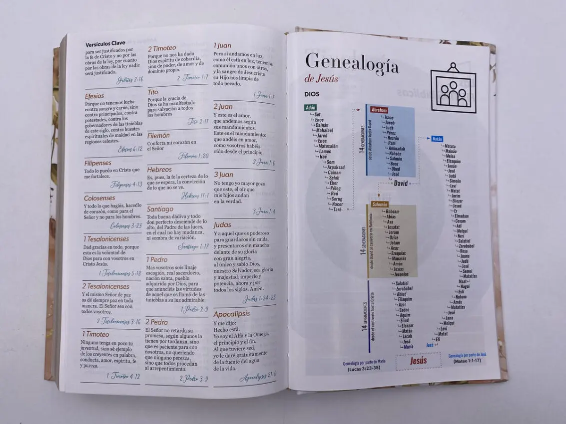 Biblia manual Hojas de otoño Reina Valera 1960, cubierta tela impresa sobre tapa dura, canto color plateado, palabras de Jesús en rojo, concordancia , concordancia de personajes bíblicos. Ayudas, referencias cruzadas. 32 páginas a todo color con ayudas y esquemas. 12 mapas a todo color .Letra 12 puntos con versículos seguidos