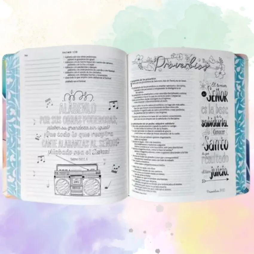 La Biblia Inspira NTV utiliza la expresión creativa para conectarte con Dios y con las Escrituras. Esta Biblia de una sola columna con amplio margen para anotaciones contiene más de 400 hermosas ilustraciones creadas por artistas latinoamericanos para colorear e inspirar la creatividad mientras lees la Palabra de Dios.