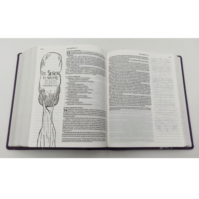 A lo largo de toda la Biblia hay ilustraciones de página completa y página parcial que dan la oportunidad de colorear versículos bíblicos para que la Biblia sea personalizada y única. Cada página tiene un margen de 5 centímetros de ancho con ilustraciones de las Escrituras en blanco y negro o un espacio con renglones claros para escribir notas y reflexiones personales o dibujar y crear. La Biblia Inspira tiene papel de Biblia de alta calidad con un tamaño de letra generoso de 8,25 que garantiza una legibilidad óptima.
