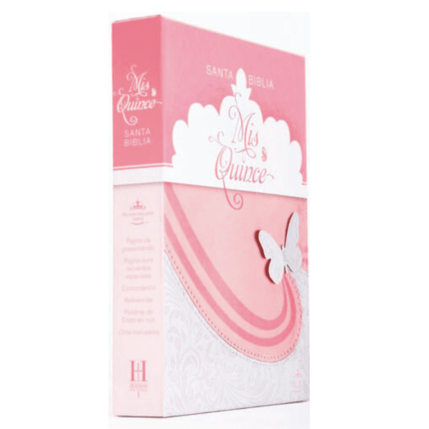 La RVR 1960 Biblia Mis Quince engalana la tradición de celebrar de manera especial el cumpleaños de quince de una jovencita. Esta edición ofrece una cubierta en símil piel y cantos plateados. Incluye una adorable caja de regalo, y cuenta con una sección para registrar recuerdos especiales.