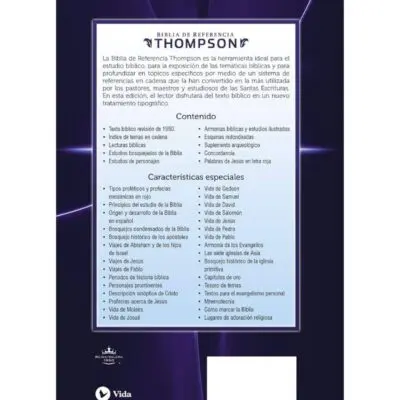 La Biblia de Referencia Thompson es la herramienta ideal para el Estudio bíblico, para la exposición de las temáticas bíblicas y para profundizar en tópicos específicos por medio de un sistema de referencias en cadena que la han convertido en la más utilizada por los pastores, maestros y estudiosos de las Santas Escrituras. En esta edición, el lector disfrutará del texto bíblico en un nuevo tratamiento tipográfico.