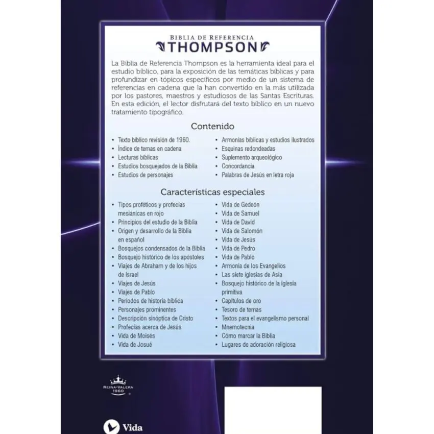 La Biblia de Referencia Thompson, versión Reina-Valera 1960, es sin lugar a dudas la Biblia más completa que se puede encontrar. Es prácticamente una biblioteca de referencia bíblica con más de 7,000 nombres, lugares y temas y más de 100,000 referencias analizadas y clasificadas de acuerdo con los conceptos.